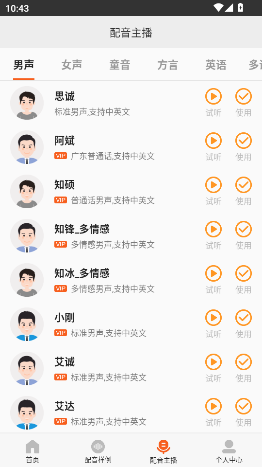 丰富素材库:内置海量背景音乐、90+主播声线(含多情感男声/女声、特色童声、英音等)及行业模板。