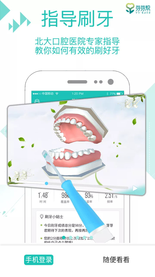 该APP与芽芽帮和北京大学口腔医院联合研发的智能刷牙指导仪连接更可指导儿童刷牙、增加儿童刷牙兴趣、评测刷牙有效性等,芽芽帮智能刷牙指导仪的成功研发可以解决儿童不愿刷牙、不会有效刷牙的问题。