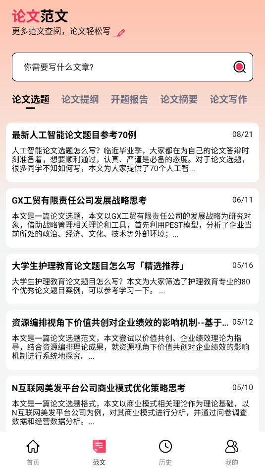 《论文写作》是一款智能生成文章的软件,app有着强大的功能,用户只需输入论文的主题或关键词,便能利用自然语言处理技术,快速分析并推荐多个新颖且具有研究价值的选题。同时,它还能根据用户选择的选题,自动生成结构清晰、逻辑严密的论文大纲,帮助用户快速搭建起论文的基本框架。这一功能不仅节省了用户大量构思与规划的时间,还确保了论文结构的合理性与完整性。