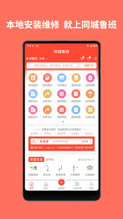 同城鲁班app是同城上门维修保洁的平台,这里有大量专业的师傅为大家提供了便捷的维修服务。漏水、空调维修、上们安装等等都可以通过app进行下单,师傅快速上门为你提供维修服务,平台担保更放心,而且没有任何中介费,大家可以放心下载使用。