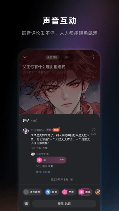 -互动社区交流:声音互动、评论区叠楼,多种方式参与创作交流;