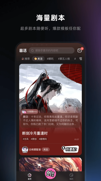 音活app可以利用ai来写剧本,同时还能为你的剧本配上声音,绝对的有意思,还能一键变声改变风格,让你的剧本活过来,是你创作的好地方,还能在社区进行语音交流互动,更多的剧本模版等你来配,喜欢的小伙伴们不要错过了。
