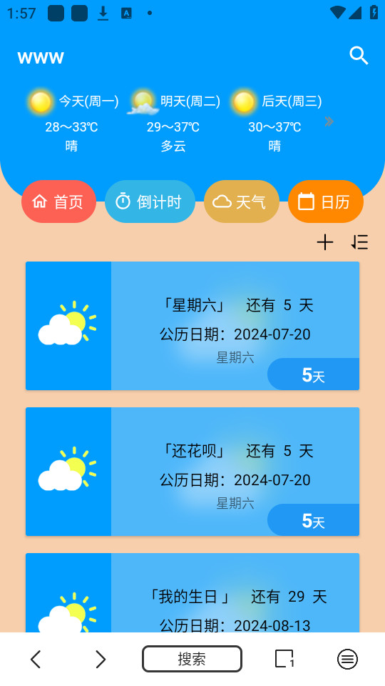 打开WWW就可以直接搜索问题或者浏览网页,而且没有开屏广告。www内置了:计算器、日历、天气预报、快递查询 等多个网页小工具,一个抵多个手机应用。