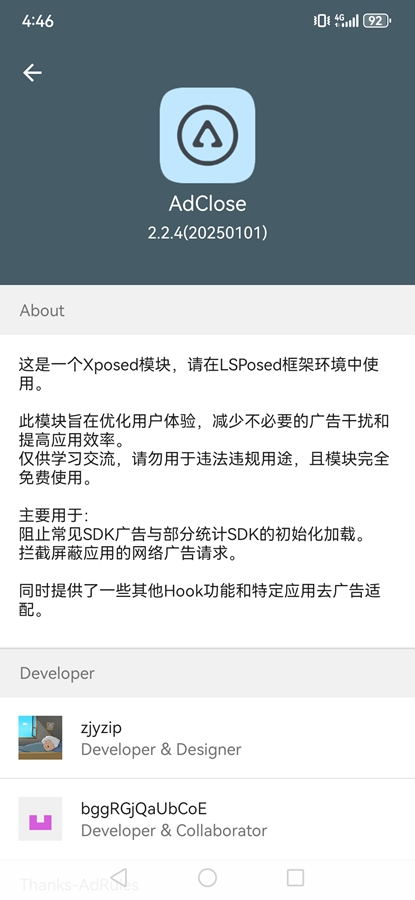 AdClose是一个基于Xposed框架的Android广告屏蔽工具,致力于提供一个无广告的应用浏览体验,旨在优化用户体验并减少干扰。请在LSPosed框架环境中使用。