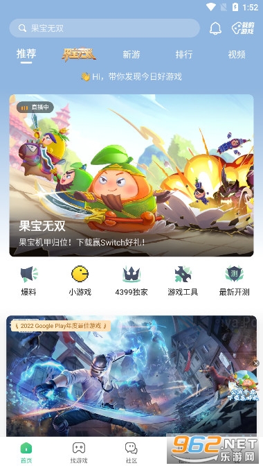 打开4399软件,在首页就可以看到软件为我们推荐的热门游戏资源,有热门游戏,大型游戏,新游抢先玩,UP资源,大厂精选,休闲等等热门的游戏资源。