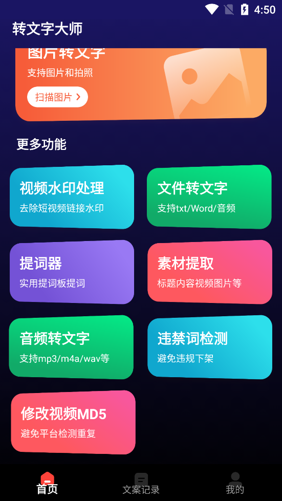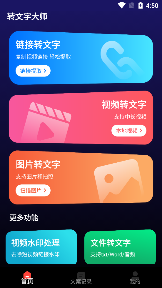 转文字大师,支持”视频转文字、链接转文字、音频转文字、图片转文字、视频链接一键获取音视频文字“等多功能于一体的一站式转文字软件,轻松且准确迅速得到您想要的文字,从而提高工作效率和便利性。无论是在日常生活中、学习中或工作中,转文字大师都能成为您的得力助手。