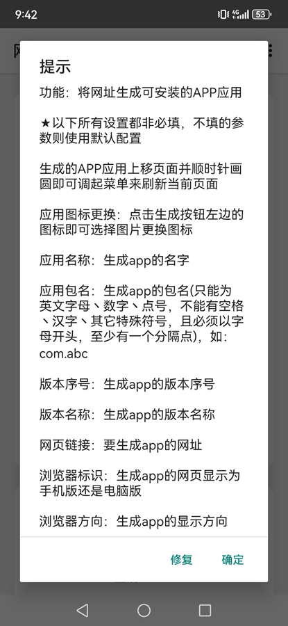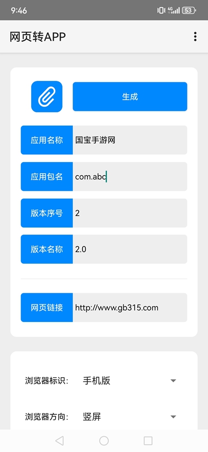 输入应用名称、应用包名、版本序号、版本名称、网页链接等信息,然后点击【生成】