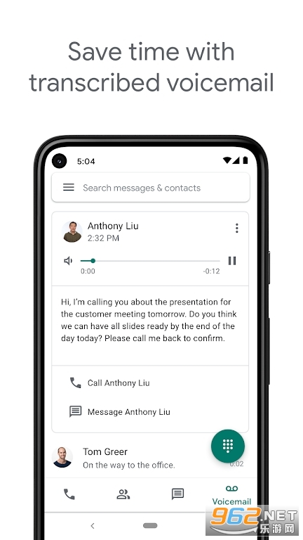 一款免费通讯软件,提供语音通话、短信、语音消息和电话转移等功能。用户可以拨打电话,也可以将此号码与自己的手机或其他电话号码绑定,实现来电转移。语音邮件转录、自动答复和呼叫筛选等。
