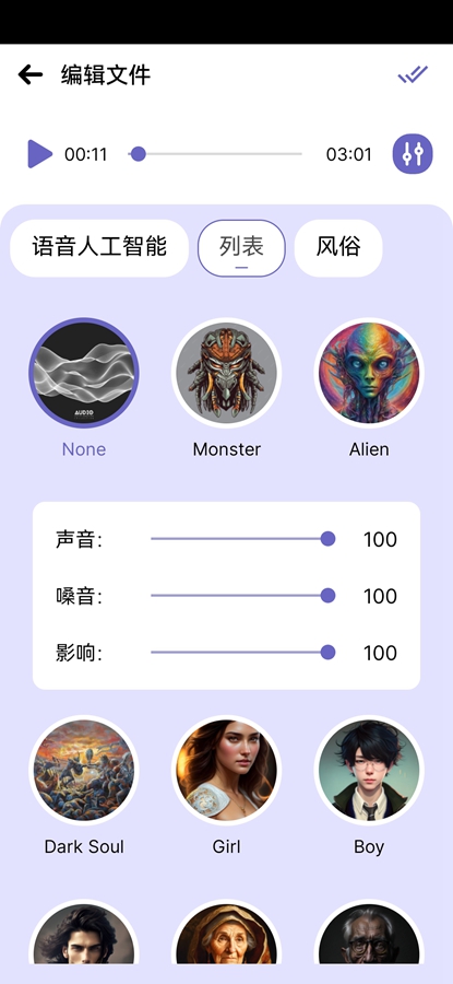 选择音频后可以选择不同的声音等