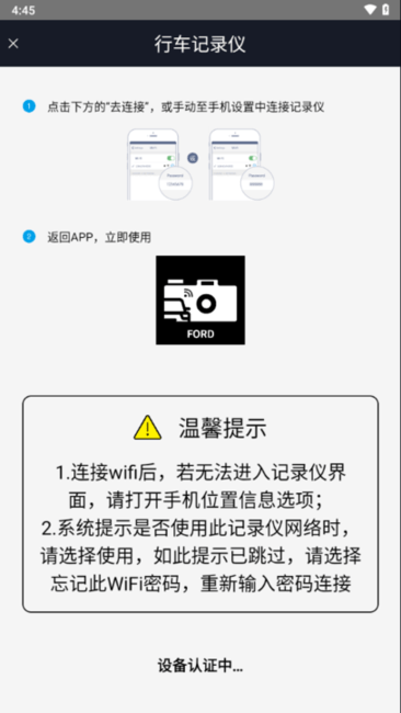 2.该应用还支持连接认证福特汽车行车记录仪设备,体积小巧,功能实用,高效管理,为用户提供便利的驾驶体验。