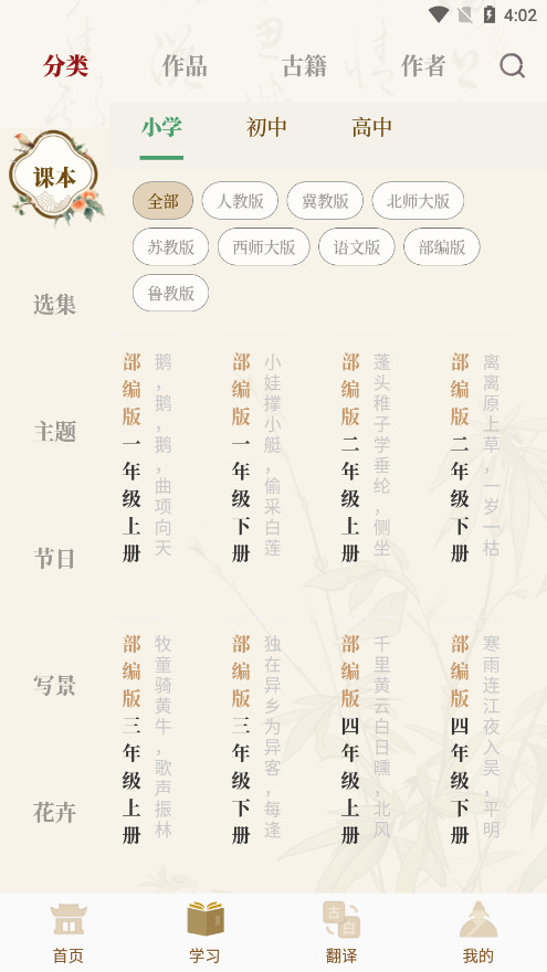 3、丰富的学习内容:涵盖小学初中高中大学各类古诗词文言文大全,包括诗经、楚辞、文言文、唐诗、宋词、元曲等经典作品。大量名篇佳作,让您尽享古诗词的韵味。