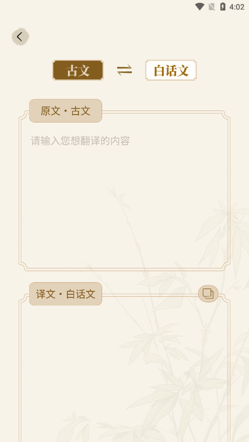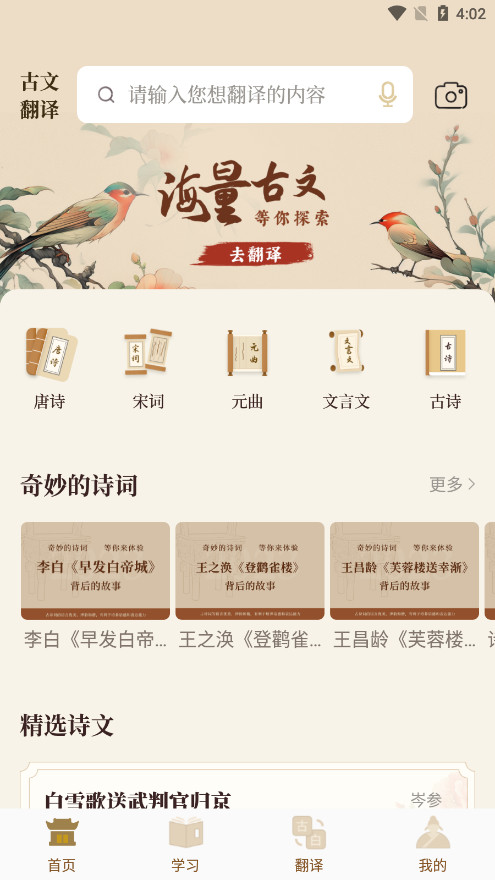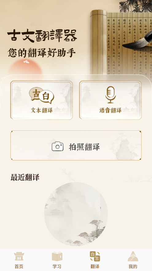 古文翻译器APP,专为文言文翻译、古诗词学习和文言文学习而设计,提供全面的文言文翻译功能,让您轻松跨越古今语言障碍,深入理解古代文字的内涵。同时,我们还为您准备了丰富的古诗词资源,帮助您领略古代文学的独特魅力。