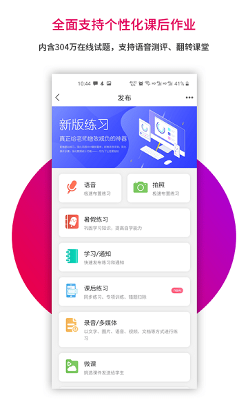 集合了很多的教育资源,让所有的老师学生,家长都能够很好的进行交流,老师也可以直接进行线上课堂和线上作业,支持朋友圈功里能,学生在这里可以发布心情,让家长可以方便共同交流、展示各项教育心得、孩子作品等。给教师和家长与孩子三者之间提供更方便共享信息和学科交流的机会。老师直接可以建立学生群或者是家长群,把重要的信息及时通知,这样就不用家长老是去学校询问情况了,轻松进行沟通,在这里老师可以开展反转课堂,使学生自由发挥想象力和观点。此外,发布作业的情况,组织班级活动等都是很方便的哦。让老师和家长的沟通更加简单,分析学生的具体情况,同时也能让家长知道老师的职教水平怎么样。