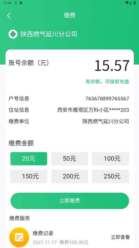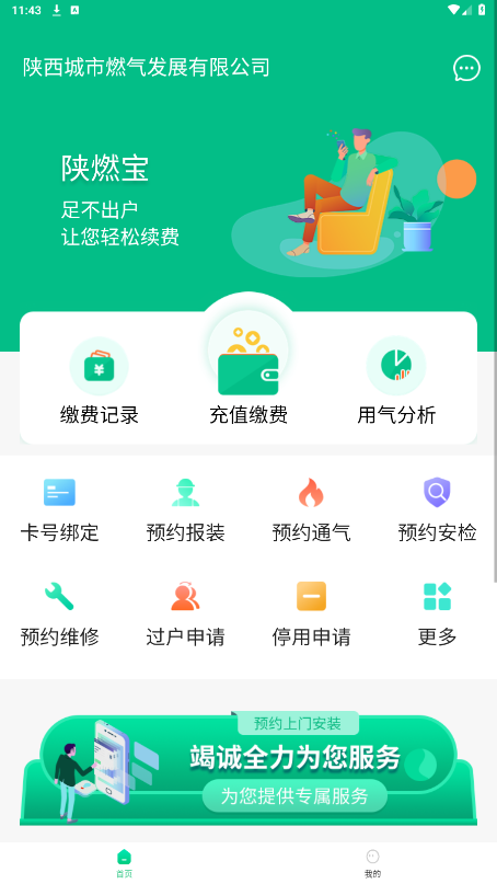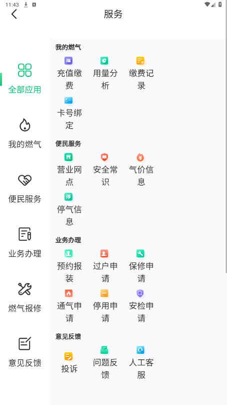 燃气服务:支持燃气缴费、卡号绑定、报装通气、服务网点查询、账单查询、预案安检、预约维修、过户申请及燃气知识学习等功能。