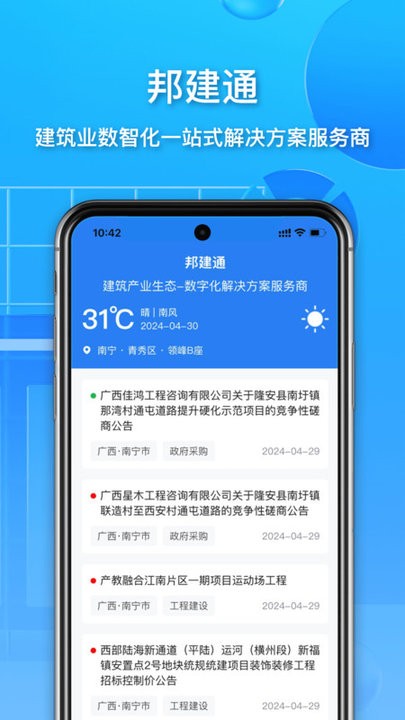 邦建通APP是邦健科技集团开发的高效管理系统平台,提供了专业的一站式解决方案,提高了建筑师们的工作效率,和安全性,功能全面设计简单好用,方便用户好上手,需要的可以来下载体验!