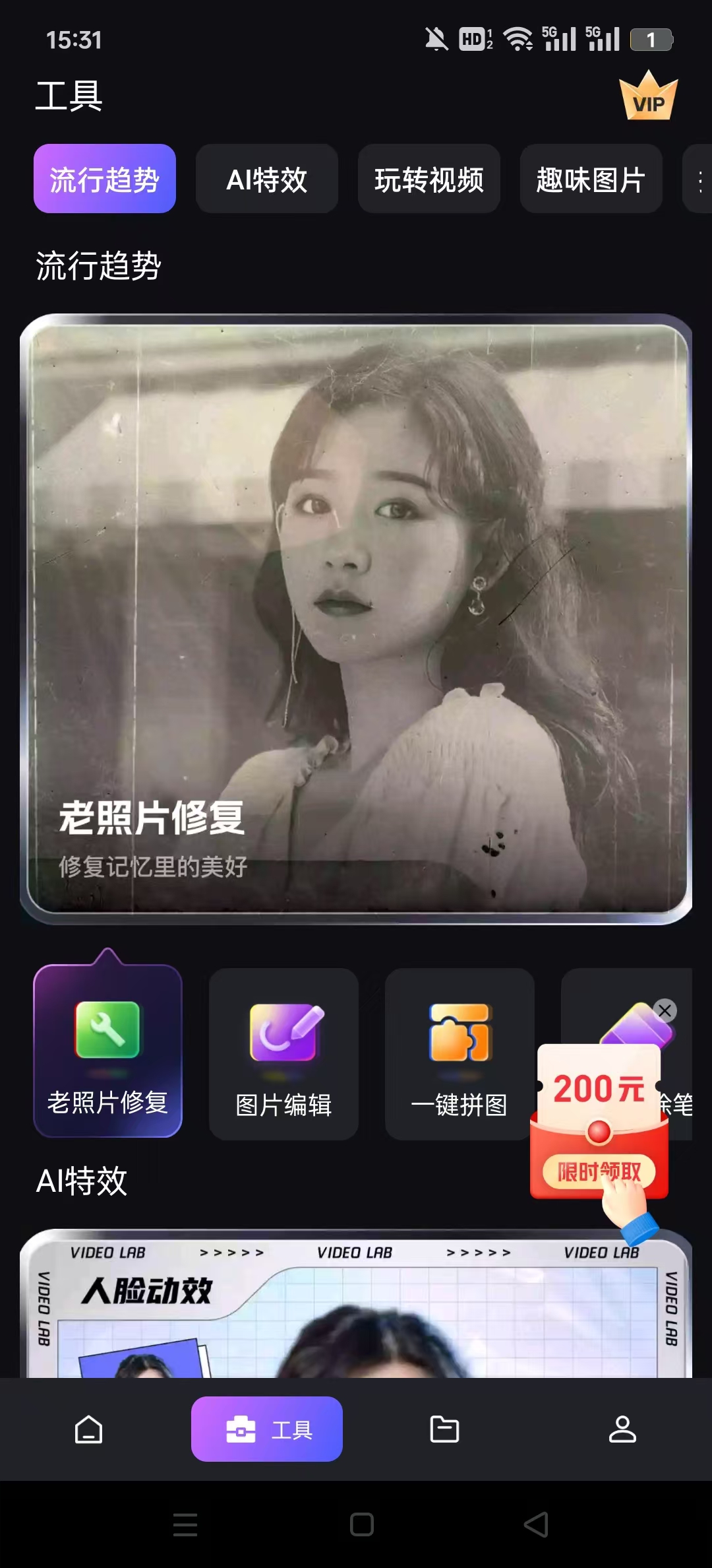 一款在视频制作和图片制作、修复方面非常强的剪辑软件,大家可以把视频上传上去,可以添加各种有趣的动效,并且软件还支持把老照片修复,那些清晰度太差或者破损的老照片,传到软件上以后就可以进行一定程度的复原,效果很强。