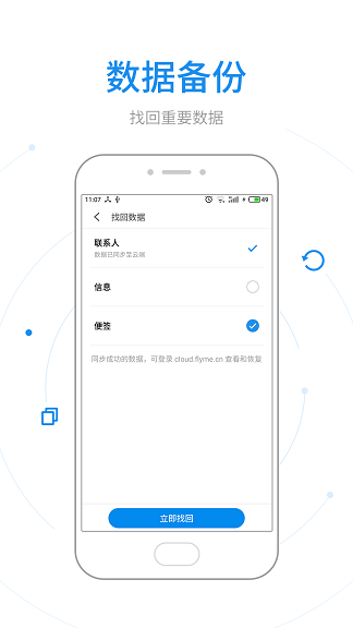 找回数据:借助数据云同步功能,远程触发备份联系人、信息、便签数据到云端。