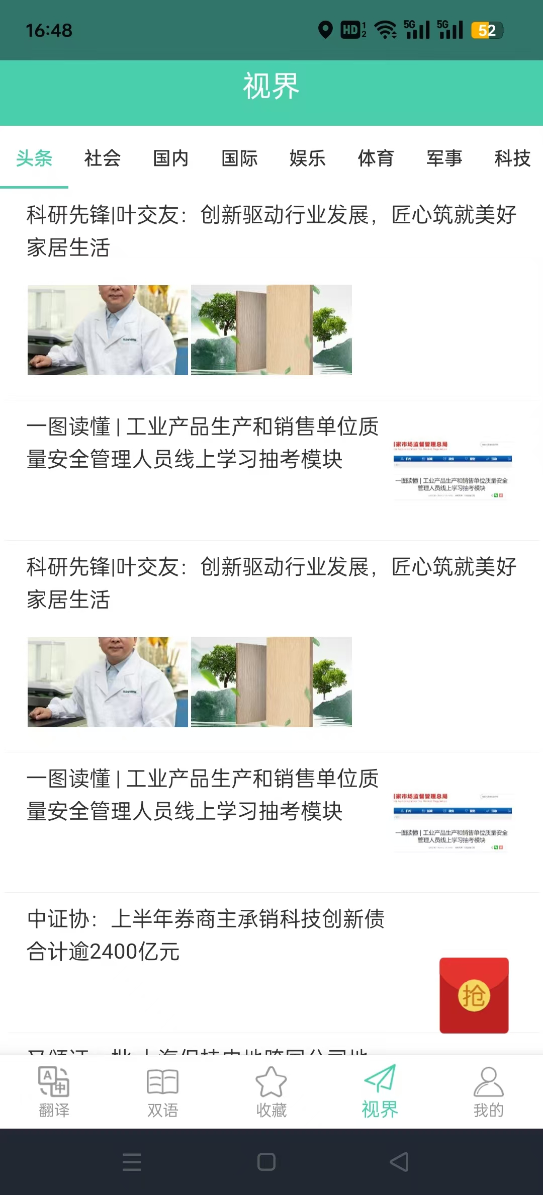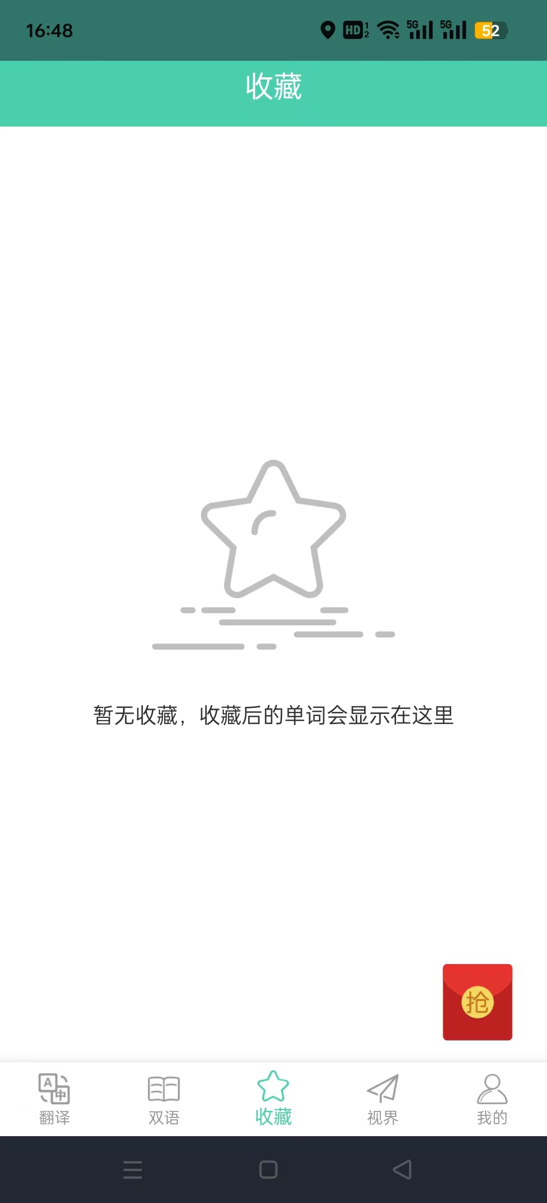 1、在本站下载安装灵格斯翻译家app以后打开,软件主要以翻译、双鱼、收藏、视界和我的5个部分组成。