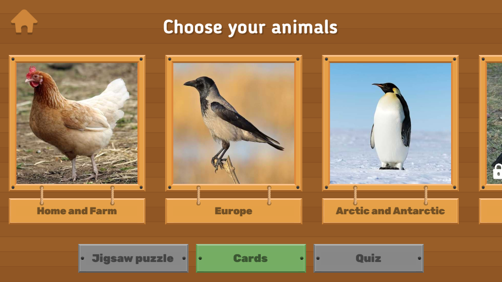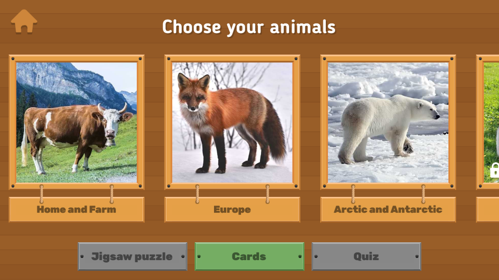 幼儿学习抽认卡分为三组:“家养动物和宠物”、“森林动物”或“世界动物”(生活在亚洲、非洲、欧洲、北美和南美、北极和南极、澳大利亚的动物)和大洋洲)。