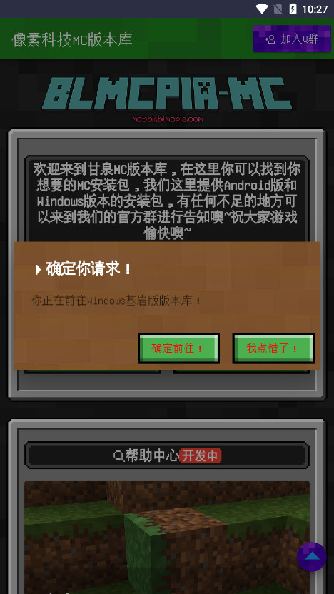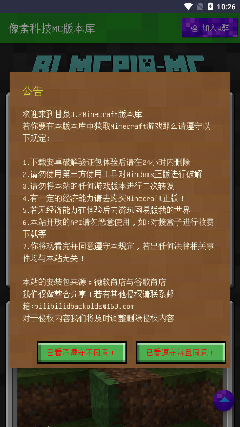 1、打开像素科技MC版本库后,仔细阅读查看公告点选【已看遵守并且同意!】进入。