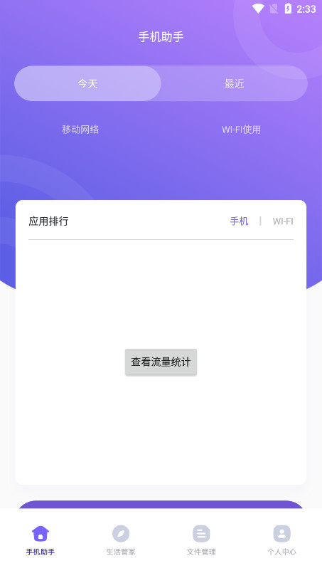 1、在【手机助手】中主要功能是查看手机/WIFI的流量统计,查看时间为当天或是最近一段时间的。
