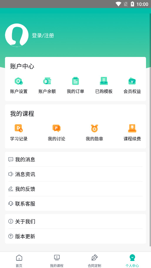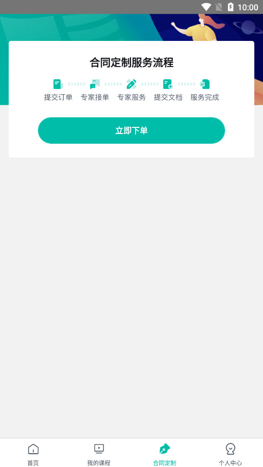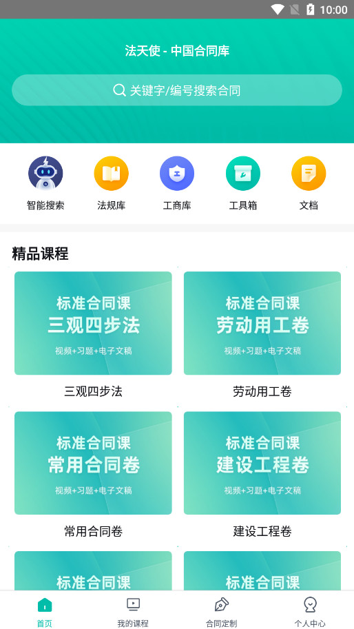 法天使官方APP,包含合同库、法规库、工商查询、工具箱和线上实训营等功能。