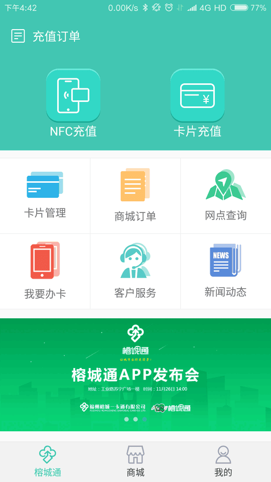 4.榕城通卡线上充值、办卡、生活缴费、NFC手机充值、网点查询及订单查询等多重功能于一体;