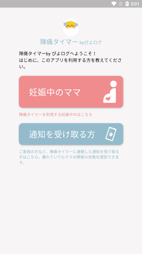 1、Piyo Log阵痛记录软件(陣痛アプリ)分为怀孕的妈妈、接受通知的工作人员两种身份。
