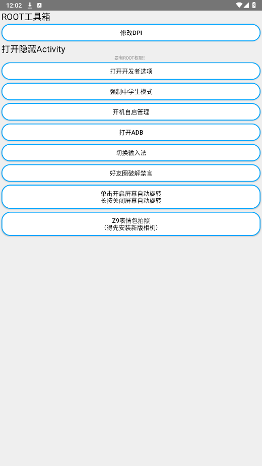 除此之外,还提供了修改DPI,打开开发者选项,强制中学生模式,开机自启动,打开adb等root功能
