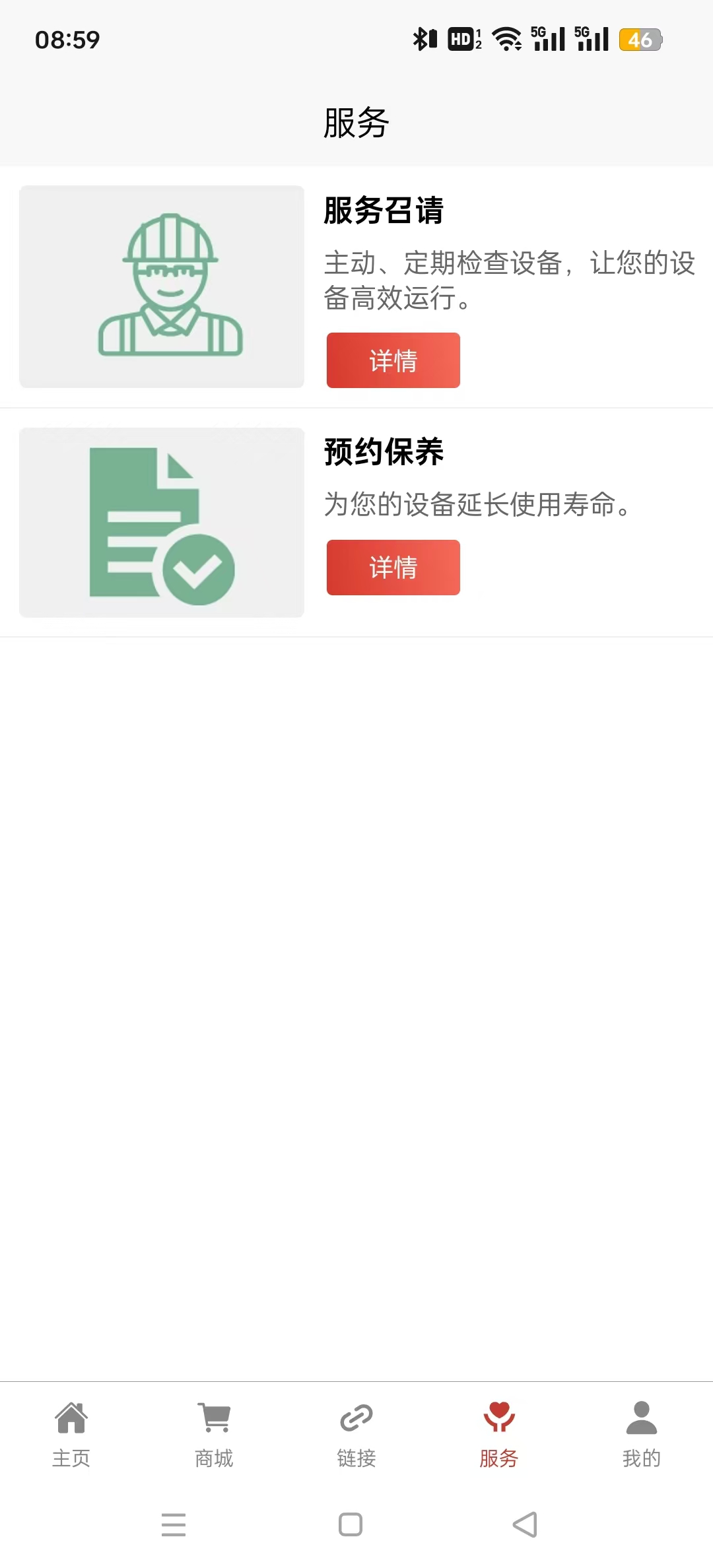 在应用程序中,用户可点击“服务”选项,该选项下包含“服务召请”和“预约保养”两项服务。用户需选择要召请的设备,创建服务订单后,五新装备会立即与您取得联系,执行您的服务需求,并在APP中实时更新服务进度。