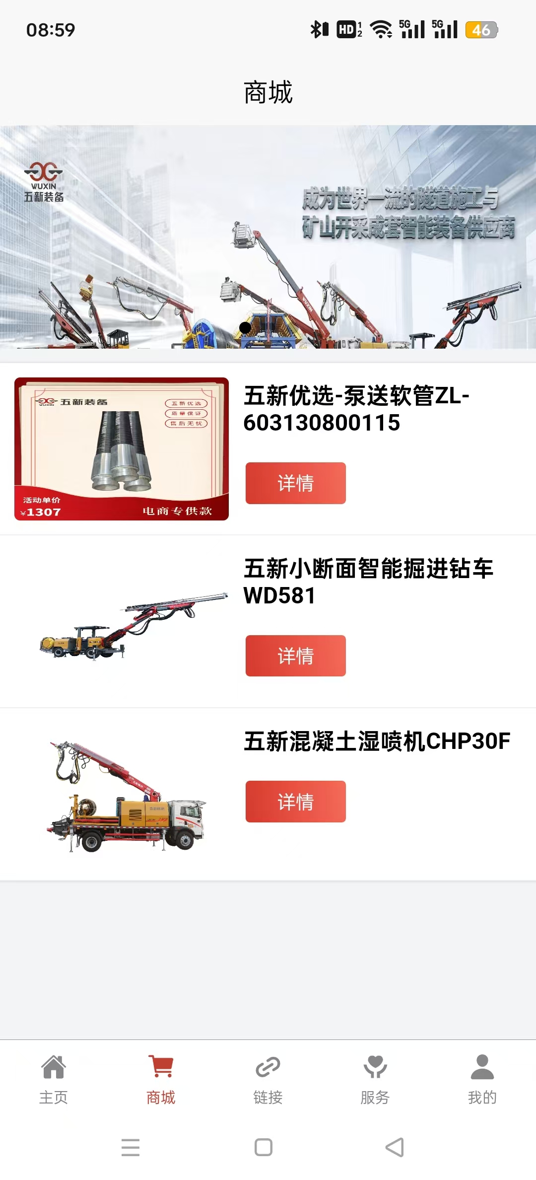 点击“商城”,选择您想了解的商品,如“主机”、“配件”或“礼品”,您能获取最新的五新装备全系列产品资讯,配件促销以及品牌商品折扣,积分兑换等丰富多彩的活动。主机商城提供最全面的五新装备工程机械产品资讯,可在线咨询产品信息。