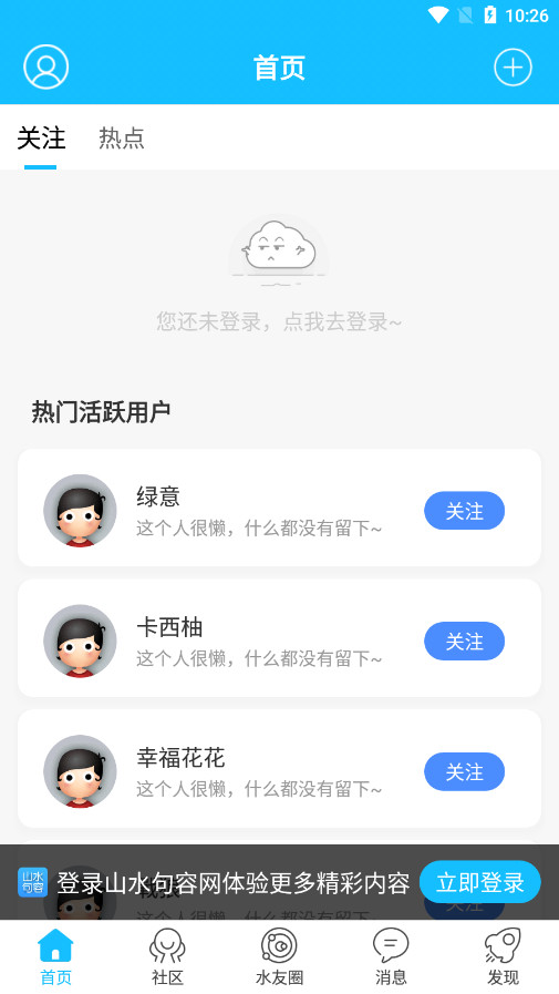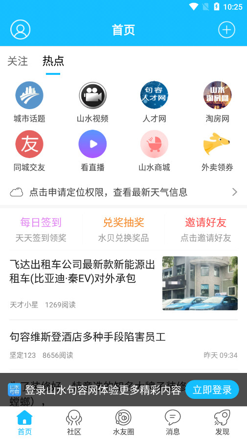 1、打开安装好的句容山水网本地新闻应用,在页面底部会有【立即登录】的提示。
