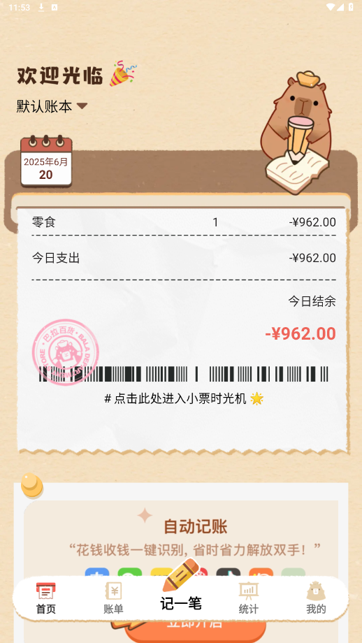 告别繁琐的手动输入时代,巴拉小店引入了先进的智能识别技术。无论你是一笔收入还是一笔支出,只需轻轻一点,可爱的卡皮巴拉就会跳出来,帮你自动记录下每一分每一毫。不必担心忘记记账。