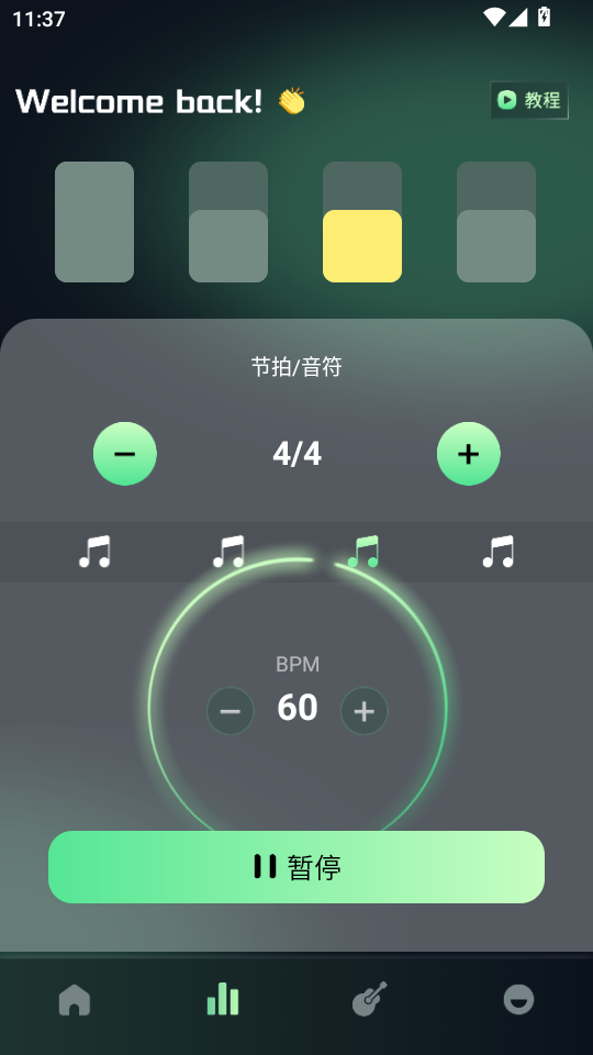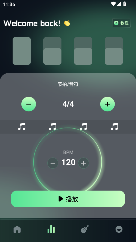 动态节拍器:提供0-300BPM可调节速度,支持4/4、3/4等常见拍号,可视化节奏引导。
