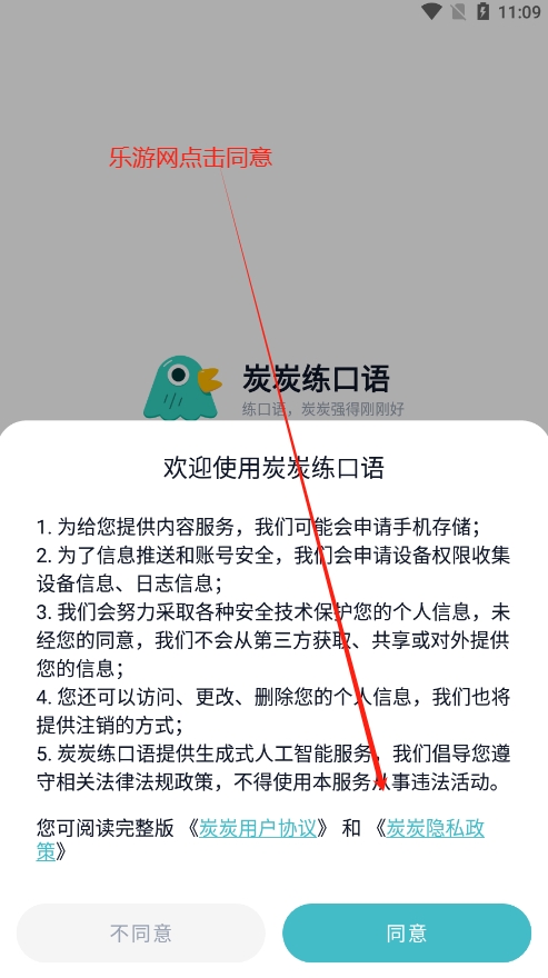 1、打开你的炭炭练口语app,安装并点击“同意”。