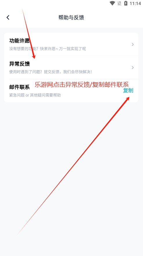 5、可直接通过app线上端进行“异常反馈”操作,或是复制邮箱地址,以邮件内容的形式发送获取,解决掉当前你所面临的尴尬问题。