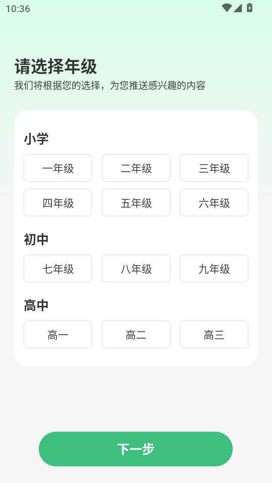 1、首次进入软件会要求选择年级,如果选错了,也可以在软件首页进行修改