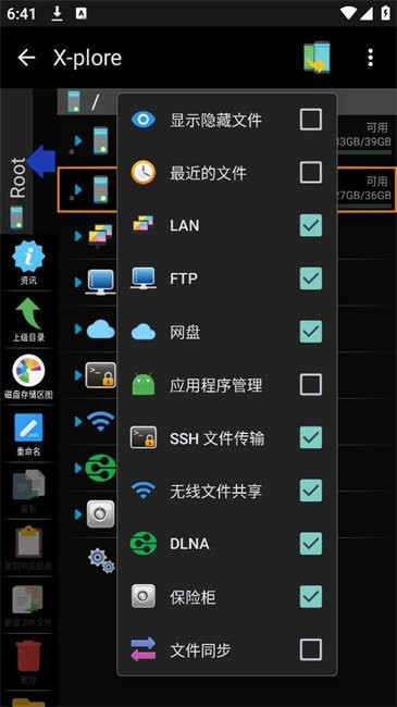 1、下载安装本软件后打开x-plore文件管理器,点击右上角三个点,
