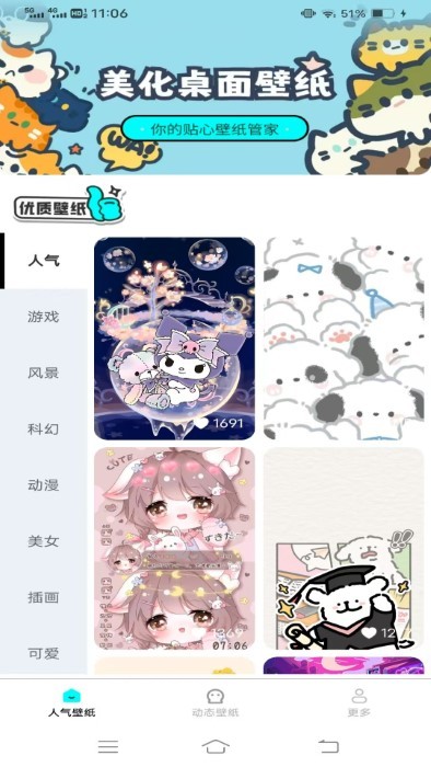 高清优选壁纸最新版旨在为用户提供丰富多样的壁纸选择,让手机屏幕焕然一新。app内壁纸种类繁多,包括热门壁纸、游戏壁纸、风景壁纸、科幻壁纸、动漫壁纸、美女壁纸、插画壁纸以及可爱壁纸等。每种分类下都有大量精选壁纸,满足不同用户的审美需求。除了静态壁纸外,app还提供多种动态壁纸效果,这些动态壁纸让手机屏幕更加生动有趣,为用户带来全新的视觉体验。