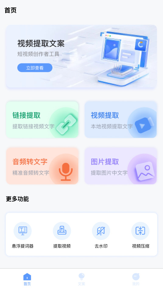 《视频提取文案》是一款多功能实用软件,专为短视频创作者设计。它支持视频转文字、语音录音转文字、一键视频文案提取等功能,让你的创作更加轻松高效。只需要就可以一键提取文案,非常的方便,同时手机号登录直接解锁会员功能,快来下载试试吧!