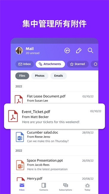 雅虎电子信箱统一整理出所有照片和文件,可一次查看所有附件。想找到某人传来的某个文件?还是三天前寄出的某张照片?莫急莫慌,都在这里。