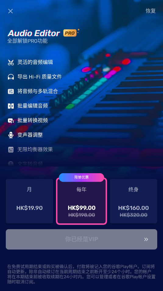 《Audio Editor》非常好用的音频编辑工具,唯一的缺点是许多功能都需要会员才能使用。所以为大家带来的vip解锁版本,你可以在这里直接使用全部的功能。在手机上就能够处理各种音频文件,有需要的话就快来下载试试吧!