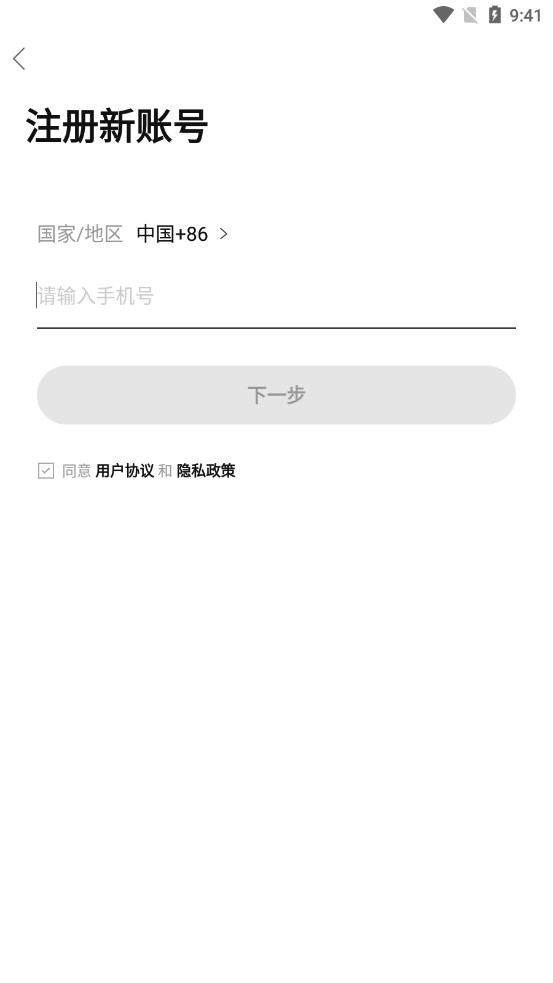 2、注册新账号,输入手机号填写验证码,完成后进行下一步。