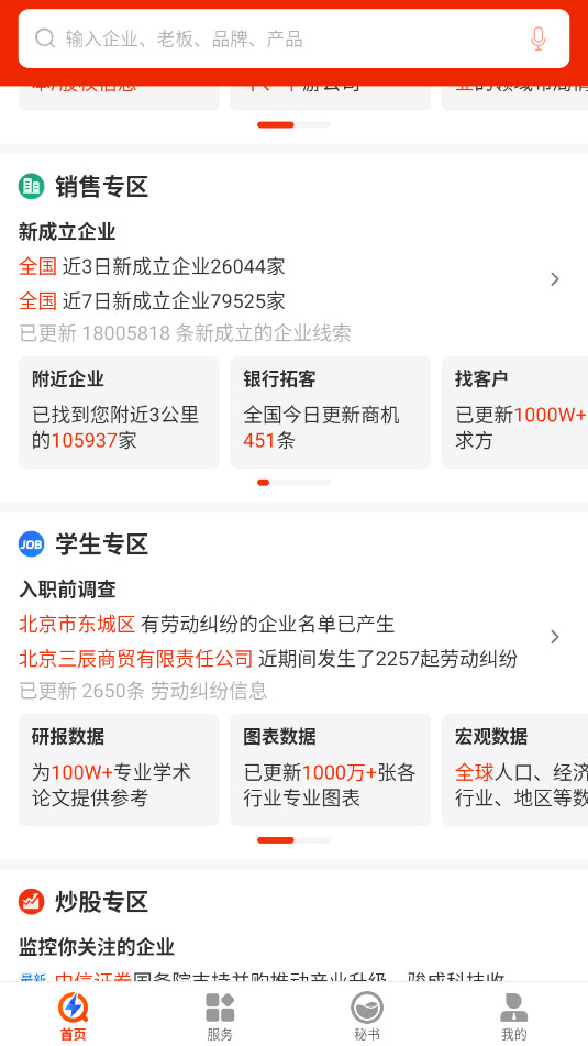 智能搜索:提供智能企业搜索功能,覆盖千万级企业总量,搜索维度涵盖法人、注册资本等。