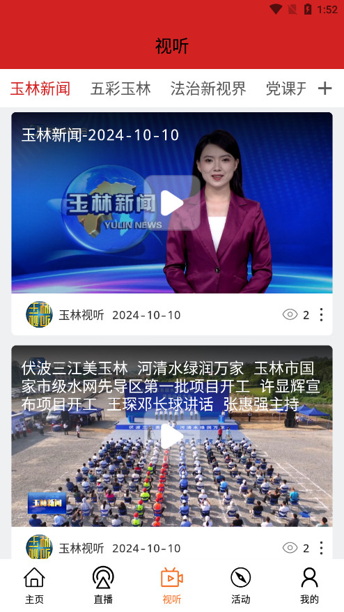 1、打开已经下载安装好的玉林视听app,找到【直播】。