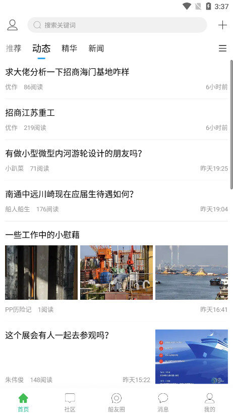 2、必须要重点讲一讲的是新增的船友圈功能,船友圈里可以发布小视频、图文、文字,工作的小细节、生活的小美好,偶尔的牢骚,闲暇时的创作都可以在这里记录。