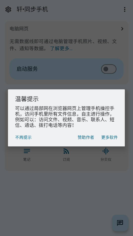 《轩同步手机电脑app》是一款革新多设备管理的利器,只需浏览器即可远程操控手机!通过局域网秒传文件、管理通讯录,甚至拨打电话,数据全程加密更安全。无需数据线,同一WiFi下电脑轻松访问手机内容,热点模式也能用。想体验“隔空取物”的便捷?点击解锁高效同步新姿势!