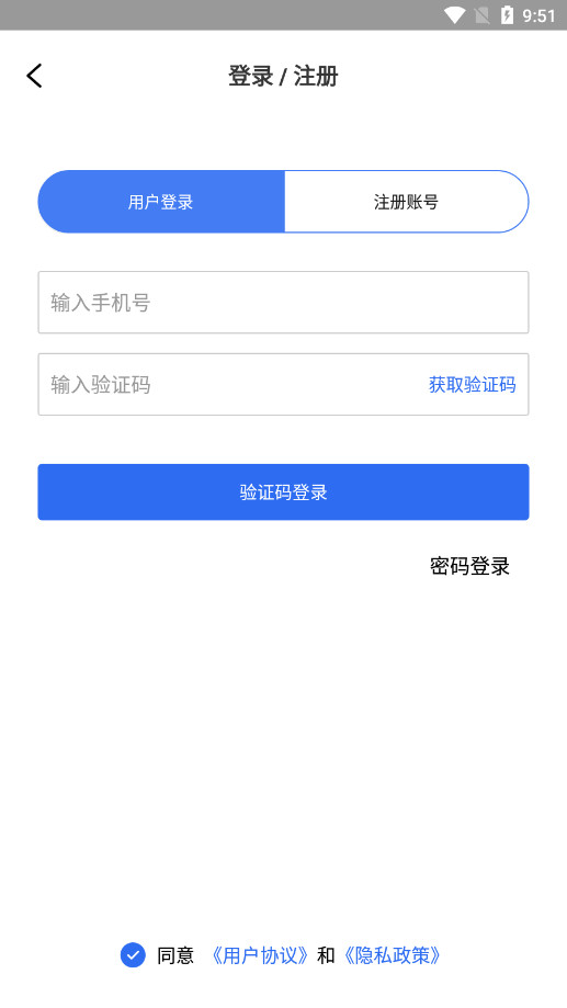 1、【登录/注册】老用户使用原有手机号接收短信验证码登录进入,新用户首次使用需要注册。