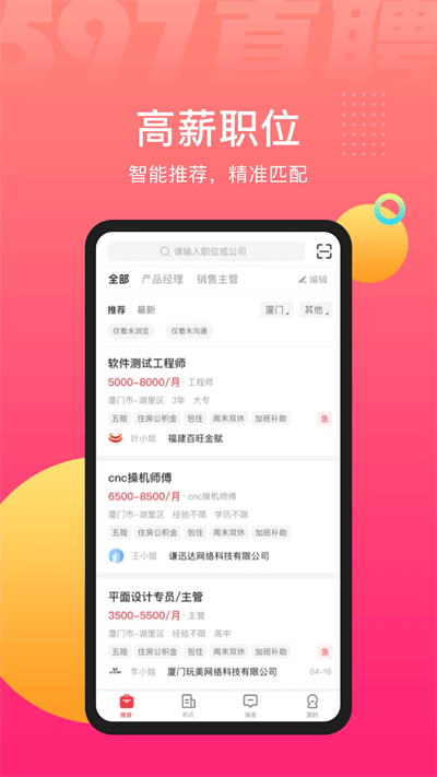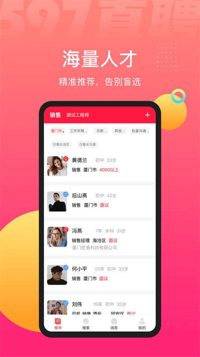 597人才网app是为求职者准备的人才市场招聘app。597人才网为您提供了求职的信息,这里有海量的职位,无数的公司正在招人,求职不用愁,赶紧来下载597人才网,找工作算什么难事,只要你来597,一切都不是事。在线就可以约谈,轻轻一点,就可以得到offer,别犹豫啦!