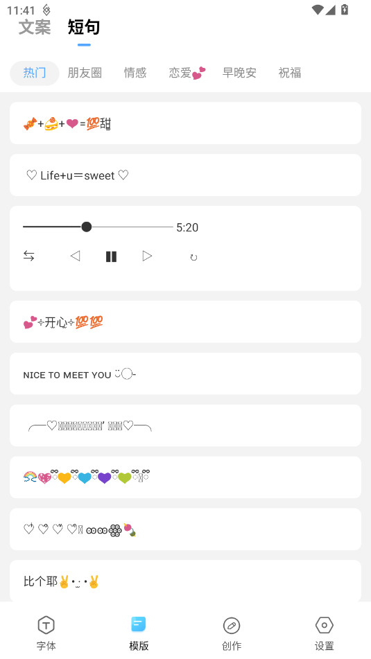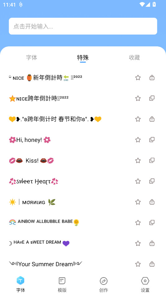 《萌文字》你的文案创意加速器!无论你是社交媒体达人,还是日常生活记录者,萌文字都能为你提供海量花样字体、文字装饰、特殊符号及颜文字表情,更有朋友圈热门文案模板等你来发现。让你的每一条文案都充满个性与趣味,轻松成为社交平台上的焦点。
